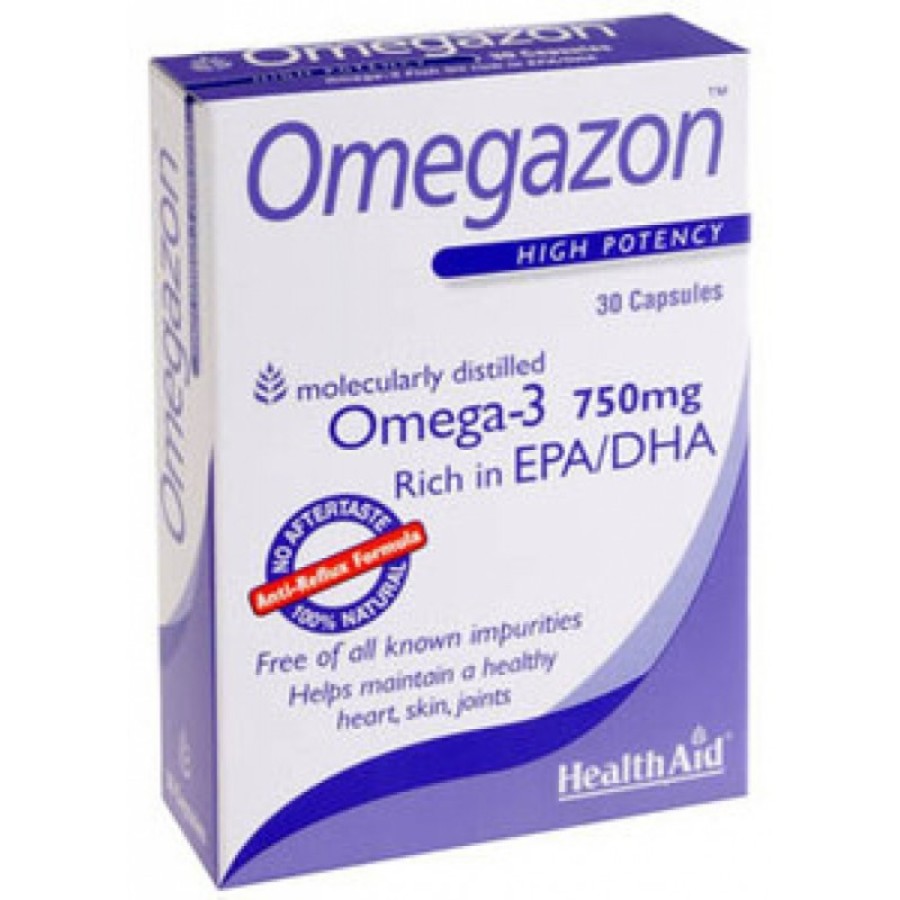 Το Omegazon της HealthAid είναι υψηλής καθαρότητας, Νορβηγικό ιχθυέλαιο, πλούσιο σε Ω3 λιπαρά οξέα (425mg EPA & 325mg DHA) ανά κάψουλα, το οποίο έχει υποστεί μια διαδικασία γνωστή ως μοριακή απόσταξη, ώστε να είναι απαλλαγμένο από βαρέα μέταλλα, διοξίνες, υδράργυρο και άλλα συστατικά με τα οποία επιβαρύνονται τα ψάρια στους ωκεανούς. Επίσης αποτελεί μια ειδική anti reflux- no after taste σύνθεση, η οποία δεν αφήνει την επίγευση ψαριού κατά τη χρήση του.