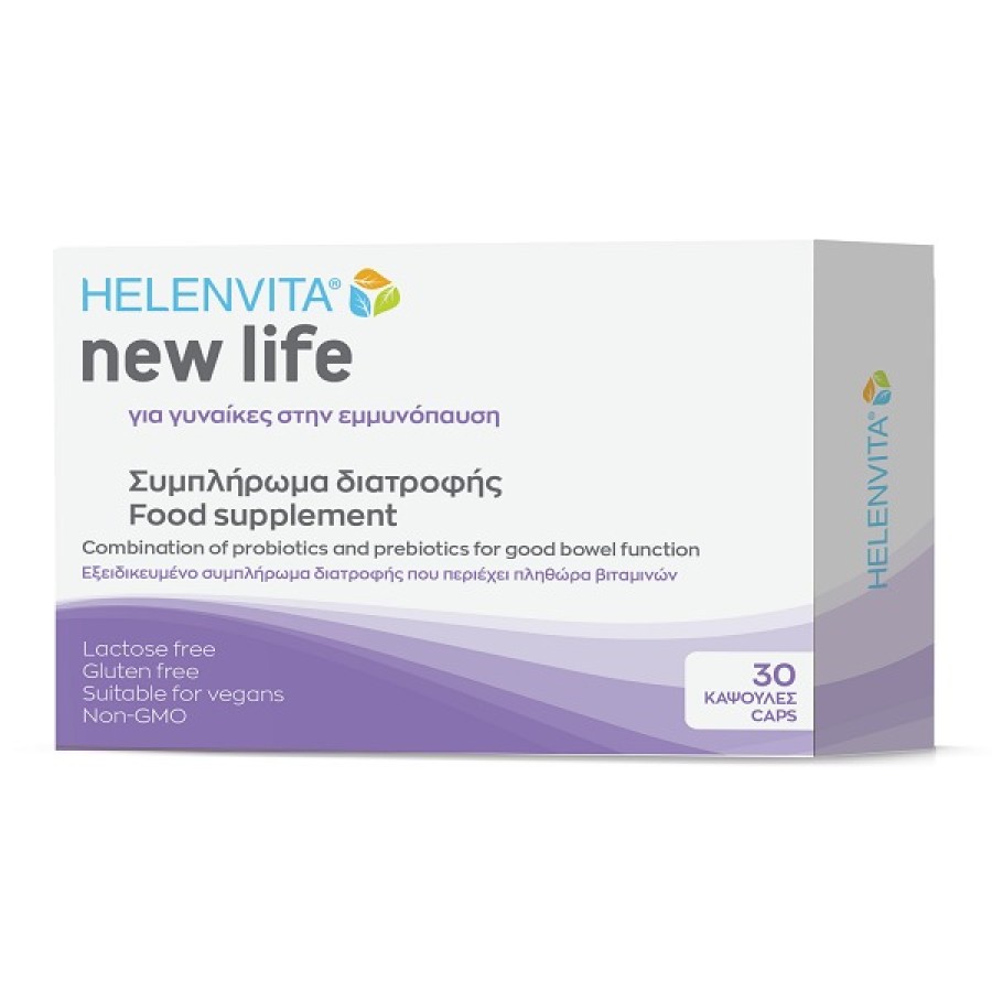 Το Συμπλήρωμα διατροφής HELENVITA NEW LIFE είναι ένα πρωτοπόρο φυτικής προελεύσης συμπλήρωμα διατροφής που περιέχει ισοφλαβόνες (εκχύλισμα σόγιας, κόκκινου τριφυλλιού-Red clover και σιμσιφούνγκας- Black cοhosh), εκχύλισμα από Φασκόμηλο, εκχύλισμα από Γαιδουράγκαθο, Βιοφλανοειδή από κίτρο και την σημαντική βιταμίνη B6.