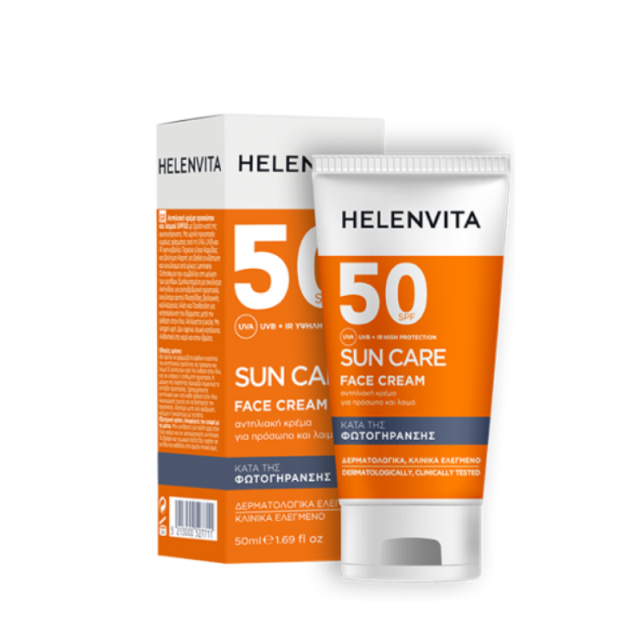 Η Helenvita Sun Face Cream SPF50 50ml, περιέχει αντηλιακά φίλτρα ευρέως φάσματος που προστατεύουν από τη UVA, UVB και IR ακτινοβολία. Το εκχύλισμα του φυτού Φυσαλίδα προστατεύει την επιδερμίδα από την IR ακτινοβολία, υπεύθυνη για τη θερμική γήρανση ενώ παράλληλα μειώνει τους ερεθισμούς που προκαλούνται από την συνεχή έκθεση στην ηλιακή ακτινοβολία. Το εκχύλισμα από το φύκος Laminaria Ochroleuca συμβάλλει στη μείωση των ρυτίδων και παρέχει στην επιδερμίδα λάμψη και ενυδάτωση. Ενισχύει τον προστατευτικό φραγμό της επιδερμίδας και προστατεύει το DNA των κυττάρων από την ατμοσφαιρική ρύπανση. Το φυσικό εκχύλισμα Ακτινιδίου, πλούσιο σε βιταμίνη C και αντιοξειδωτικά, ενισχύει τη φυσική αντηλιακή προστασία. Η Πανθενόλη και η βιολογική Αλόη ανακουφίζουν το δέρμα ενώ το έλαιο Καρύδας και το βούτυρο Καριτέ ενυδατώνουν σε βάθος.