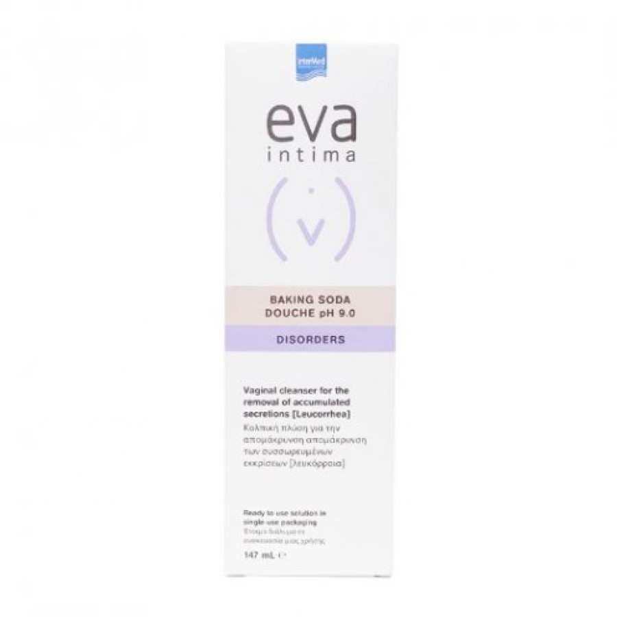 Το Eva Douche Baking Soda είναι ειδικά σχεδιασμένη κολπική πλύση μίας χρήσης με σόδα η οποία ρευστοποιεί άμεσα και απομακρύνει αποτελεσματικά τις συσσωρευμένες φυσιολογικές ή παθολογικές εκκρίσεις (λευκόρροια) από τον κόλπο, που παρατηρούνται ιδιαίτερα σε περίπτωση μυκητιασικής κολπίτιδας