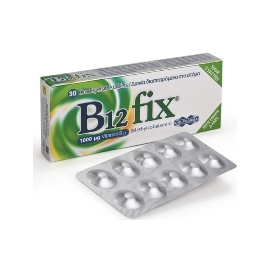 Το B12fix είναι ένα συμπλήρωμα διατροφής που συμπληρώνει τις ημερήσιες ανάγκες του οργανισμού σε Βιταμίνη Β12 μιας και κάθε δισκίο περιέχει 1000μg βιταμίνης Β12 (μεθυλοκοβαλαμίνη).