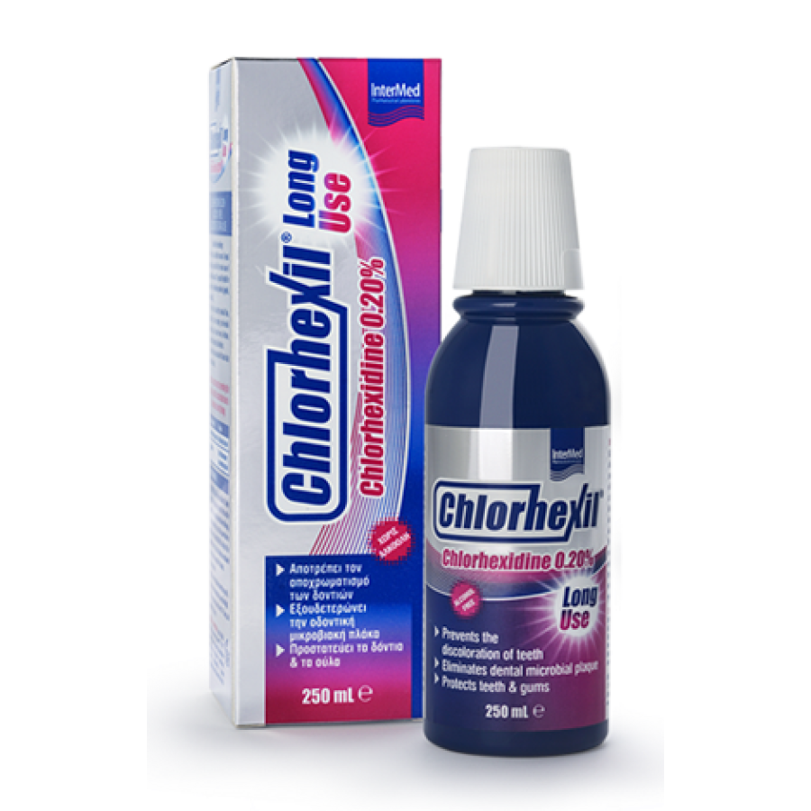 Το Chlorhexil 0,20% Mouthwash – Long Use με περιεκτικότητα σε χλωρεξιδίνη 0.20%, δημιουργήθηκε για τον δραστικό έλεγχο και την εξουδετέρωση των μικροοργανισμών της στοματοφαρυγγικής κοιλότητας, την αποτελεσματική καταπολέμηση της ουλοοδοντικής μικροβιακής πλάκας και την άμεση ανακούφιση και προστασία της στοματικής κοιλότητας από ερεθισμούς και φλεγμονές ιδίως σε περιπτώσεις περιοδοντικής νόσου (περιοδοντίτιδας), φαρυγγίτιδας, αμυγδαλίτιδας κ.α.