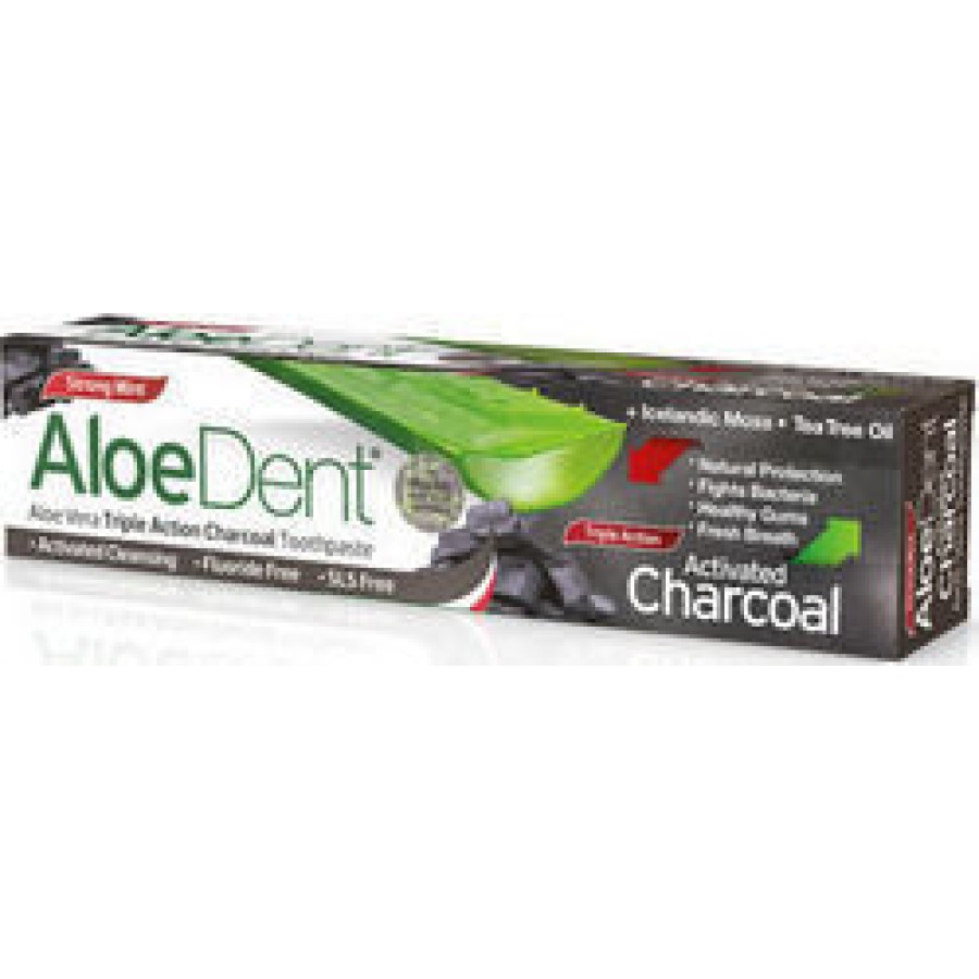 Η Aloe Dent Triple Action Charcoal της Optima αποτελεί μια οδοντόκρεμα με τριπλή δράση που έχει ως βάση την Αλόη Βέρα αντί για νερό.