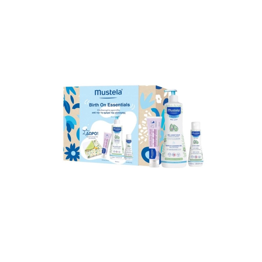 Mustela Birth On Essentials Gentle Cleansing Gel - 500ml, Body Lotion - 100ml, Diaper Rash Cream - 100ml & ΔΩΡΟ Βρεφικό Μπουρνούζι Promo Σετ από την Πρώτη ημέρα Γέννησης