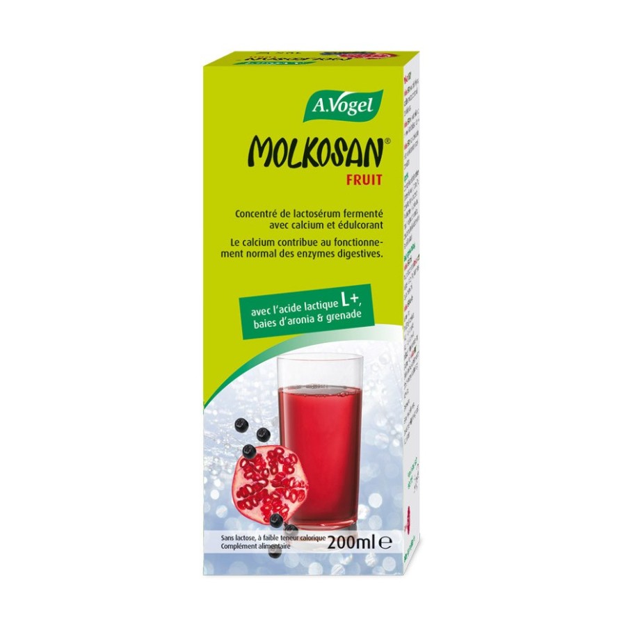 Prebiotic oral supplement With lactic acid and pomegranate and aronia juice For the health of the intestinal flora No lactose, gluten, sugar, fat, calories Suitable for vegetarians It is made from milk of organic origin With stevia A. Vogel Molkosan Fruit is a prebiotic oral nutritional supplement made from whey, with a high content of lactic acid. Contains calcium, aronia, pomegranate juice and the natural sweetener stevia. Prebiotics enhance the proper functioning of the digestive system as they help the beneficial probiotic bacteria. Thus ensuring a healthy digestive system, Molkosan helps in cases of bloating, gas, constipation.