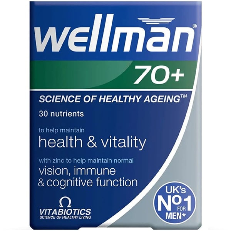 Το Wellman 70+ προσφέρει μοναδική υποστήριξη για άνδρες αυτής της ηλικιακής ομάδας και αποτελεί μέρος της σειράς Vitabiotics Wellman, της κορυφαίας μάρκας συμπληρωμάτων διατροφής για άνδρες στο Ηνωμένο Βασίλειο.