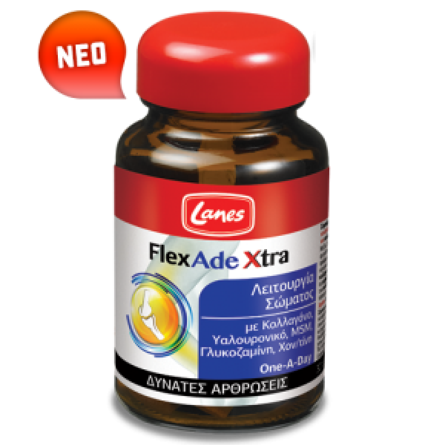 Το FlexAde Xtra είναι ένας καινοτομικός και πλήρης συνδυασμός πολύτιμων θρεπτικών συστατικών που χάρη στις ιδιότητές τους μπορούν να βοηθήσουν στην καλή υγεία των αρθρώσεων και στην αντιμετώπιση διαταραχών αυτών. Περιέχει γλυκοζαμίνη, χονδροϊτίνη, κολλαγόνο, MSM, υαλουρονικό, βιταμίνη C & μαγγάνιο σε σταδιακής αποδέσμευσης ταμπλέτα για την καλύτερη κάλυψη του οργανισμού στα συστατικά καθ’ όλη τη διάρκεια της ημέρας. Η γλυκοζαμίνη, πρόδρομος ουσία των γλυκοζαμινινογλυκανών & πρωτεογλυκανών, και η χονδροϊτίνη είναι σημαντικά συστατικά για τις αρθρώσεις και πολύτιμα για την ανάπτυξη και αναδόμηση του χόνδρου. Επιπλέον το κολλαγόνο, δομικό στοιχείο, με το υαλουρονικό και το MSM αποτελούν πολύτιμα συστατικά του οργανισμού. Σύμφωνα με μελέτες τα ενεργά συστατικά βοηθούν στην αντιμετώπιση πόνου των αρθρώσεων και σε περιπτώσεις εκφυλιστικής αρθρίτιδας.