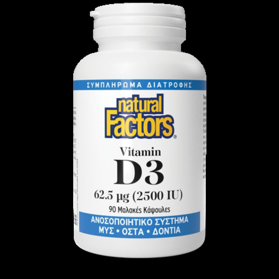 Το Natural Factors Vitamin D3 2500 IU είναι ένα υψηλής ποιότητας συμπλήρωμα βιταμίνης D3 (χοληκαλσιφερόλη), σχεδιασμένο για την καθημερινή ενίσχυση του οργανισμού. Η βιταμίνη D3 συμβάλλει στη σωστή λειτουργία του ανοσοποιητικού συστήματος, στη διατήρηση υγιών οστών και δοντιών, καθώς και στη φυσιολογική λειτουργία των μυών. Παράλληλα, βοηθά στην απορρόφηση του ασβεστίου και του φωσφόρου και στη διατήρηση φυσιολογικών επιπέδων ασβεστίου στο αίμα.