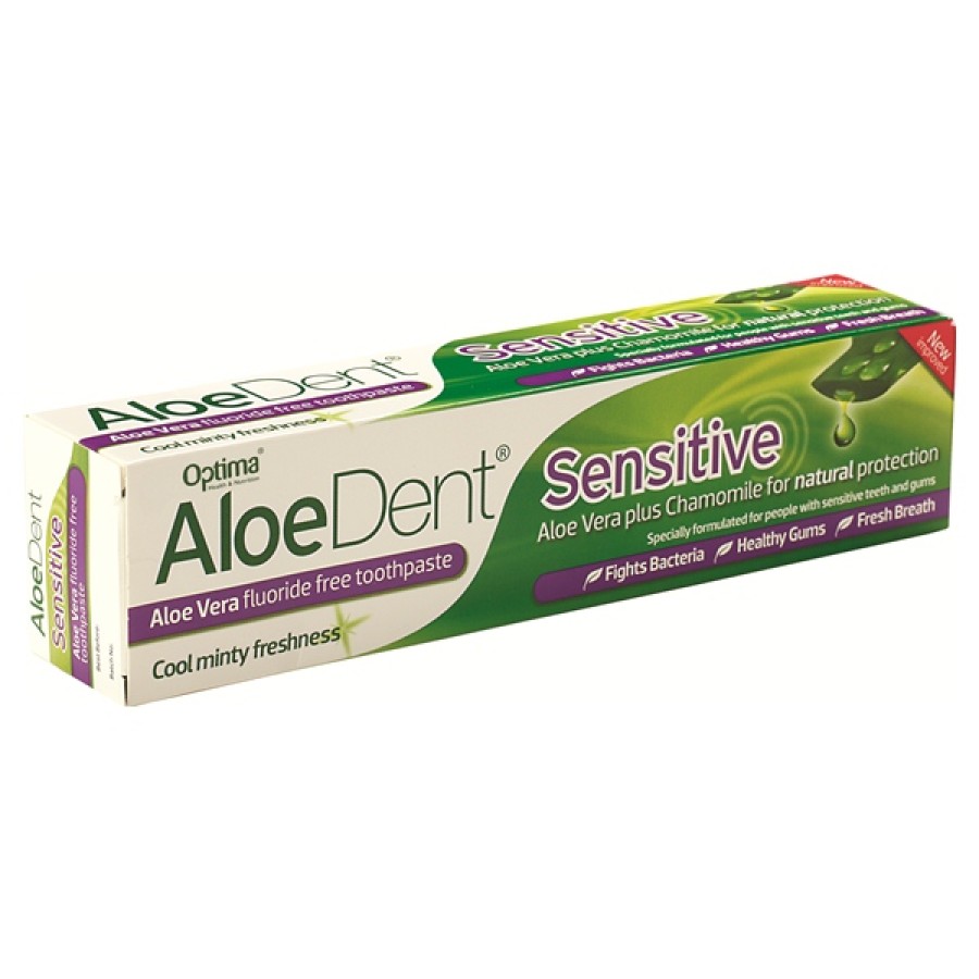 Η Aloe Dent Sensitive Toothpaste περιέχει μαλακτικό ζελέ φυσικής αλόης με ανακουφιστική δράση, πράσινο τσάι – κατά των βακτηρίων, έλαιο τεϊόδεντρου για αντισηπτική δράση, συνένζυμο Q10 για υγιή ούλα, πυρίτιο για φυσική λεύκανση των δοντιών, χαμομήλι για ανακουφιστική δράση και μενθόλη για φυσική γεύση μέντας. Παράλληλα δεν περιέχει φθόριο .