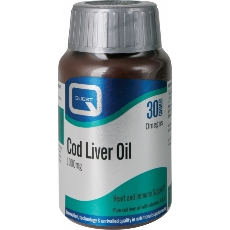 To συμπλήρωμα διατροφής Cod Liver Oil 1000mg της Quest περιέχει 1000mg μουρουνέλαιου ανά κάψουλα που αποδίδει τα δραστικά αντιφλεγμονώδη ωμέγα-3 λιπαρά οξέα EPA & DHA μαζί με βιταμίνες A και D. Τα θρεπτικά αυτά συστατικά μειώνουν τις φλεγμονές, τη δυσκαμψία και τον πόνο των αρθρώσεων που σχετίζεται με την αρθρίτιδα. Επίσης, υποστηρίζουν την καρδιαγγειακή υγεία και διατηρούν τη χοληστερόλη σε καλά επίπεδα. Αυτό το συμπλήρωμα διατροφής αποτελεί επιπλέον μια καλή πηγή βιταμινών A και D.