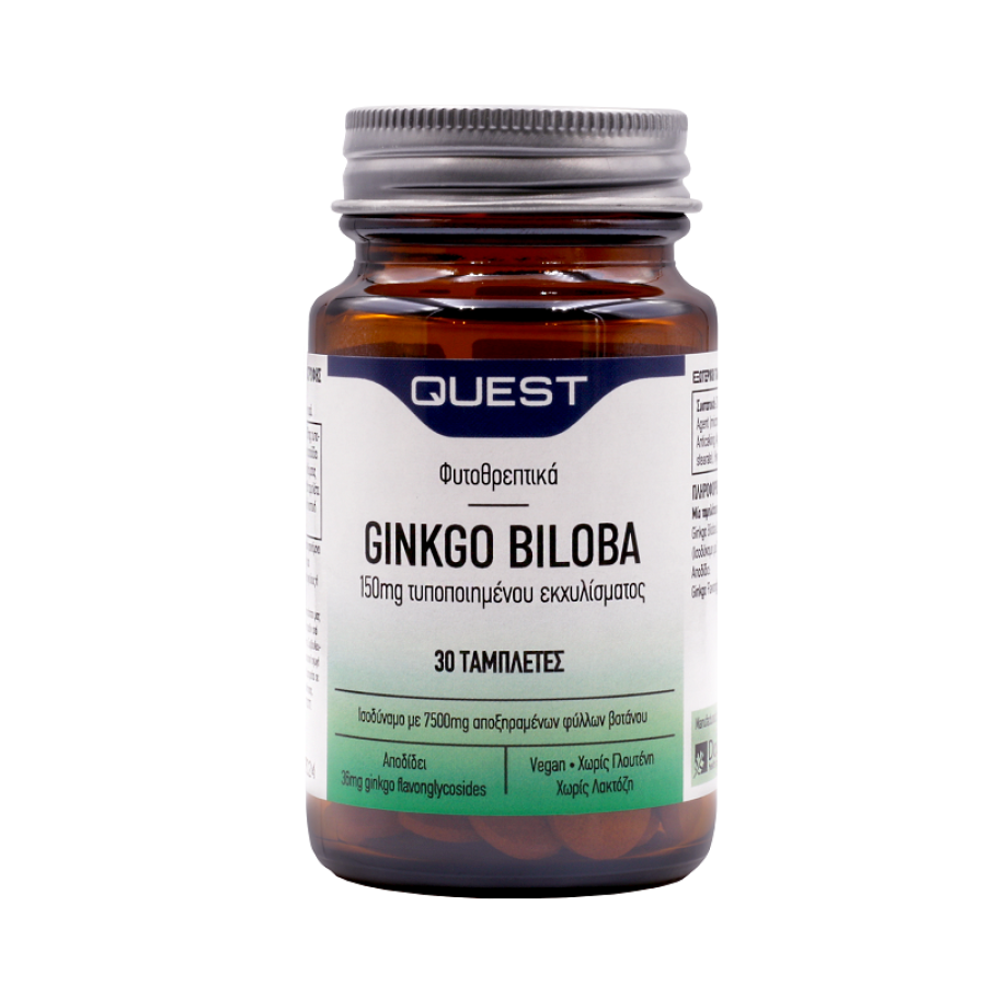 Το τυποποιημένο εκχύλισμα φύλλων Ginkgo Biloba 150mg (γίνκο το δίλοβο ή σαλιβουρία) της Quest παρέχει 36mg ginkgo flavonglycosides, 4,5mg ginkgolides A, B και C και 3,8mg bilobalide ανά ταμπλέτα. Τα συστατικά του Ginkgo Biloba προάγουν την καλή κυκλοφορία του αίματος σε όλα τα μέρη του σώματος συμπεριλαμβανομένων του εγκεφάλου και των άνω και κάτω άκρων. To Ginkgo Biloba πιστεύεται ότι μπορεί να βοηθήσει στη βελτίωση της μνήμης και της πευματική απόδοσης και να καθυστερήσει την εμφάνιση ή την εξέλιξη της άνοιας, ειδικά αν ληφθεί σε αρχικά στάδια. Providing 24% ginkgo flavonglycosides. Equivalent to 7500mg dry leaf