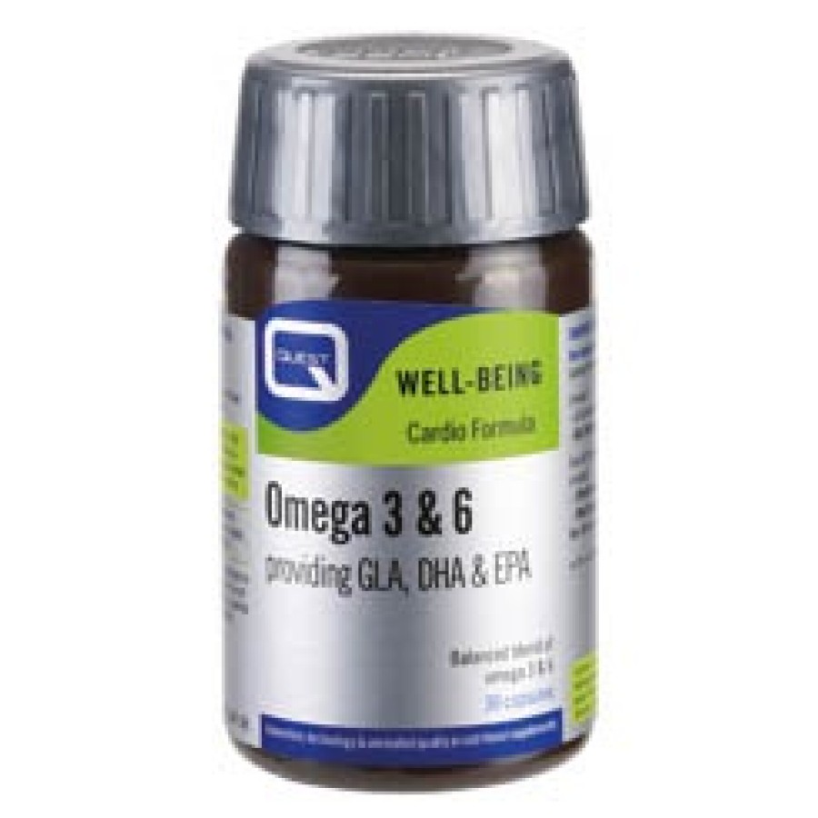 To συμπλήρωμα διατροφής Omega 3 & 6 της Quest είναι ένας μοναδικός συνδυασμός ελαίου νυχτολούλουδου, ελαίου μποράντζας και ιχθυελαίου που προσφέρει μια ισορροπία των ωμέγα-3 και ωμέγα-6 απαραίτητων λιπαρών οξέων που απαιτούνται στην καθημερινή διατροφή. Τα ωμέγα-3 και ωμέγα-6 λιπαρά οξέα είναι απαραίτητα για βιολογικές λειτουργίες του οργανισμού, συμπεριλαμβανομένης της κυτταρικής λειτουργίας και ακεραιότητας. Επίσης, υποστηρίζουν την υγεία των αρτηριών και της καρδιάς και διατηρούν τα επίπεδα της χοληστερόλης σε καλά επίπεδα. Τα ωμέγα-3 & ωμέγα-6 λιπαρά οξέα DHA, EPA και GLA είναι σημαντικά κατά τη διάρκεια της εγκυμοσύνης και του θηλασμού για την ενίσχυση της αύξησης και ανάπτυξης του βρέφους, συμπεριλαμβανομένης της λειτουργίας των ματιών και του εγκεφάλου.