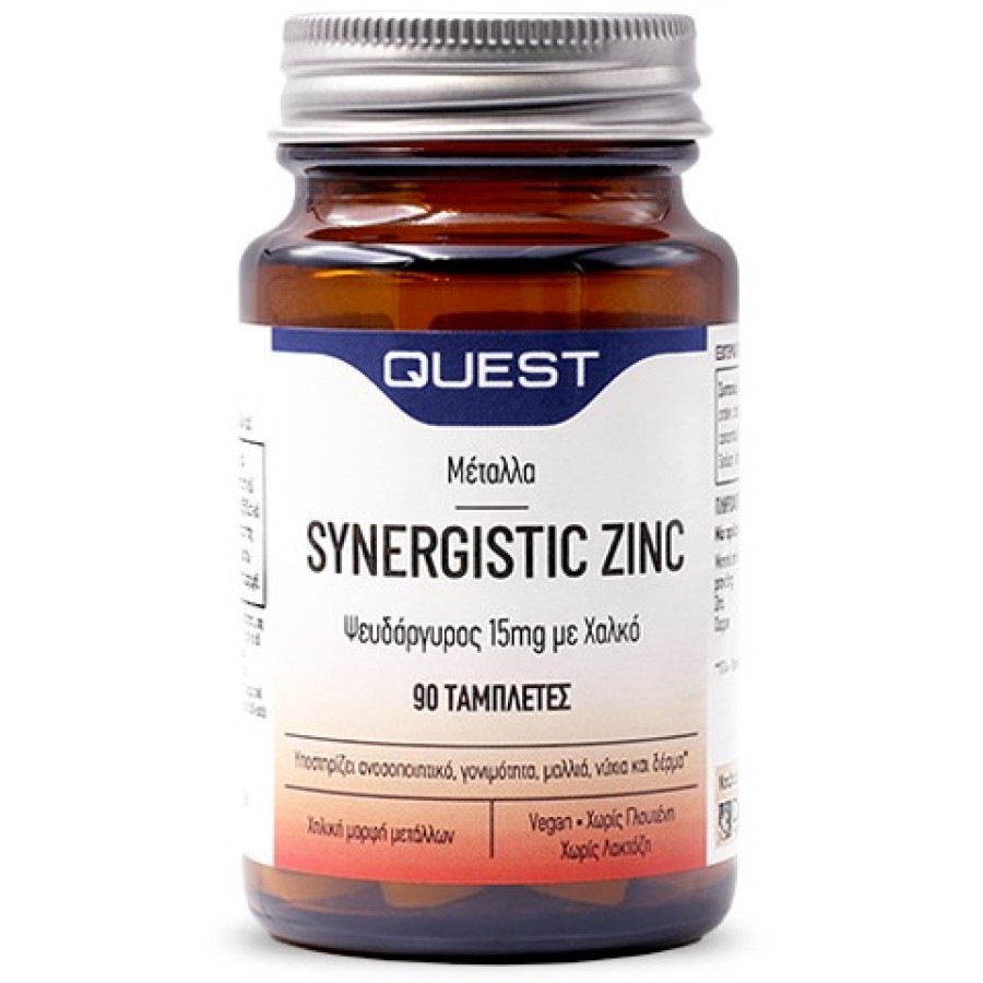 Το συμπλήρωμα διατροφής Synergistic Zinc 15mg της Quest παρέχει στον οργανισμό ψευδάργυρο και χαλκό που αυξάνει τη απορρόφησή του. Ο ψευδάργυρος είναι γνωστός για τις επουλωτικές του ιδιότητες γι’ αυτό και παίζει σημαντικό ρόλο στην επούλωση πληγών και στη διαδικασία επούλωσης στομαχικών ελκών. Είναι πολύ σημαντικός για την υγεία του δέρματος και τη σωστή λειτουργία και απόκριση του ανοσοποιητικού συστήματος. Επίσης, ο ψευδάργυρος είναι σημαντικό συστατικό για τη σωστή λειτουργία του ανδρικού αναπαραγωγικού συστήματος.