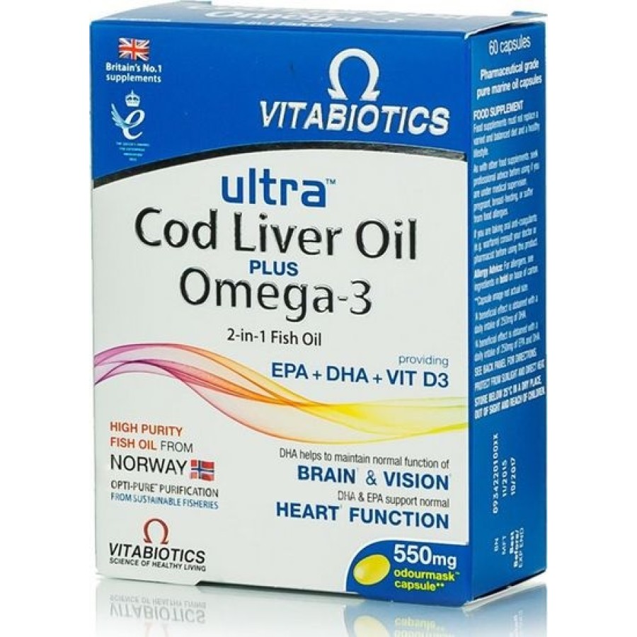 Το συμπλήρωμα διατροφής Ultra 2 in 1 Cod Liver Oil Capsules της Vitabiotics είναι μια μοναδική σύνθεση με ωμέγα-3 ιχθυέλαιο και μουρουνέλαιο σε αναλογία 1:1. Τα ωμέγα-3 ιχθυέλαια αποτελούν μια πλούσια πηγή των ωμέγα-3 απαραίτητων λιπαρών οξέων DHA και EPA, ενώ το μουρουνέλαιο εκτός από ωμέγα-3 λιπαρά οξέα, παρέχει μεγάλες ποσότητες φυσικών βιταμινών D και Α. Τα ωμέγα-3 λιπαρά οξέα έχουν σύμφωνα με πολυάριθμες μελέτες πολλαπλά οφέλη σε πολλούς τομείς της ανθρώπινης υγείας.