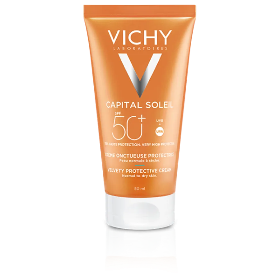 - Η αντηλιακή κρέμα Capital Soleil από τη Vichy για Βελούδινη Επιδερμίδα SPF 50+ είναι σχεδιασμένη για να προσφέρει υψηλή και αποτελεσματική προστασία στην επιδερμίδα σας. Με SPF 50+, εξασφαλίζει υψηλή προστασία από τις βλαβερές UV ακτίνες, ελαχιστοποιώντας τον κίνδυνο εγκαυμάτων και πρόωρης γήρανσης της επιδερμίδας.