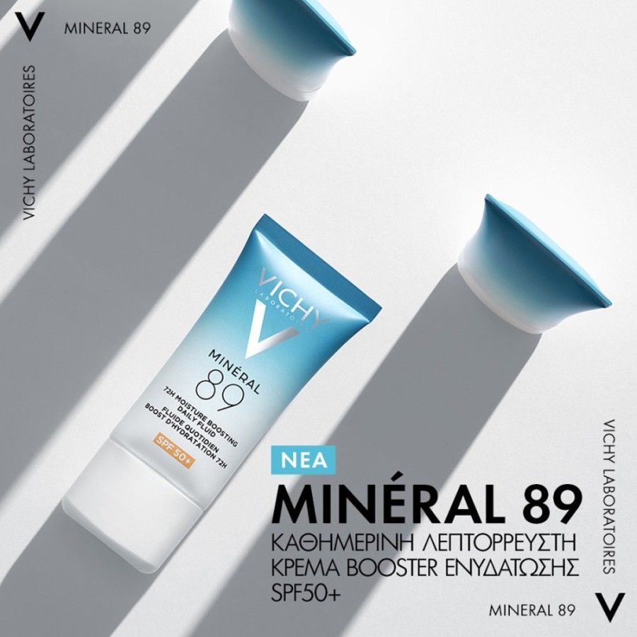 H Mineral89 καθημερινή λεπτόρρευστη κρέμα Booster ενυδάτωσης 72Η με Spf50+ έχει μία μοναδική σύνθεση με υαλουρονικό οξύ + μεταλλικά στοιχεία από το ιαματικό ηφαιστειακό νερό της Vichy + βιταμίνες Β3 & Ε + σκουαλάνιο σε συνδυασμό με πολύ υψηλή προστασία Spf50+ προσφέροντας ενυδάτωση και προστασία της επιδερμίδας. Η υφή της είναι ανάλαφρη και λεπτόρρευστη, κατάλληλη και για την ευαίσθητη επιδερμίδα.